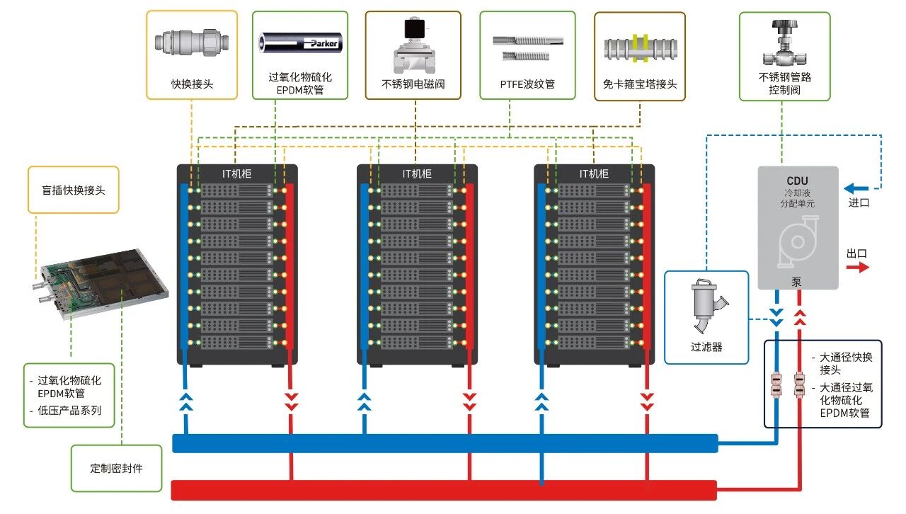 涵蓋電子液冷專用軟管、快換接頭、免卡箍寶塔連接技術(shù)、盲插快換模塊、不銹鋼管路控制閥等核心組件,確保管路連接無泄漏;